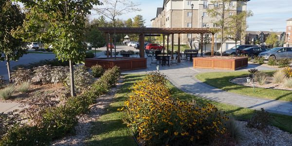 An amenity area was constructed in the center of the 3-building development to provide tenants with an outdoor leisure space which was coined ‘Tavern on the Green’. At the southern end of Upper West recreational amenities were implemented into the traditional SWM facility by furnishing a fitness loop track and outdoor exercise equipment. Additionally a playground was constructed in the northern end of the site to give children an area to burn off some energy. By employing various amenity spaces it was important to provide all demographics with an outdoor space where users can take in the beautiful scenery surrounding Upper West.